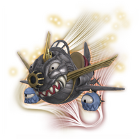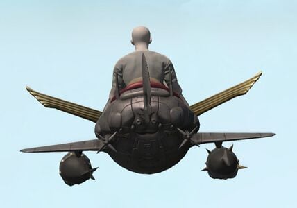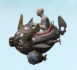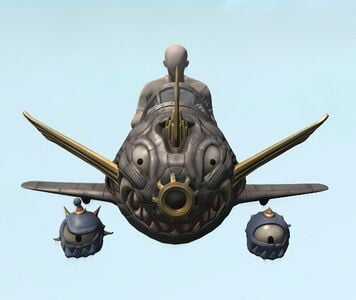 From the amount of ordinance equipped, one can gather that this oddly shaped airship was employed in battle. However, being from the Sigmascape, who employed it and when are anyone's guess. The shark maw painted on its bow suggests an underwater civilization.
