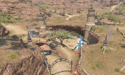 Situated along the Royal Allagan Sunway connecting Ul'dah with Gridania, Camp Drybone sits perilously close to Amalj'aa territory. As such, it is home to a great host of Immortal Flames, who are ever on alert for beastman attacks.