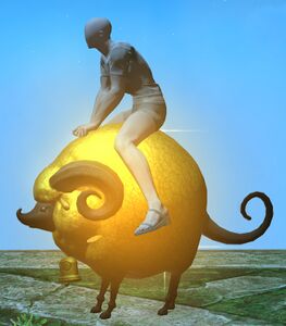 Instead of the white commonly seen in its kind, the fleece of this sheep is a remarkable golden hue. While the seller insisted that it is the golden ram of legend, as with all such claims, this should be taken with a pinch of salt. Only time and perhaps a new growth of wool will reveal the creature's true nature.— In-game description