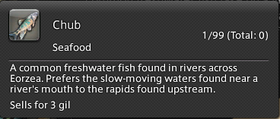 When spawning, the head, belly, and tail of this common freshwater fish take on a vibrant red hue─a color which, across Eorzea, traditionally represents happiness and longevity. Because of this, chubs are often given as gifts to newlyweds.