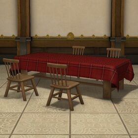 “Enjoy the bucolic life with this wooden dining set for four, finished with a checkered tablecloth.