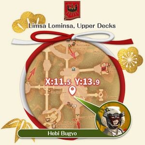 Start the event by talking to Hebi Bugyo in Limsa Lominsa Upper Decks (x11.5,y13.9) to start the quest Heavensssturn Trivia. Players must be level 15 or higher.