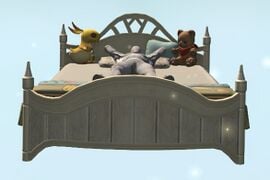 Crafted especially for children, this magicked bed hovers by virtue of crystals sourced from floating isles, and gives the sensation of sleeping on a cloud. The design is said to be directly inspired by the beds used at Menphina's Arms.— In-game description