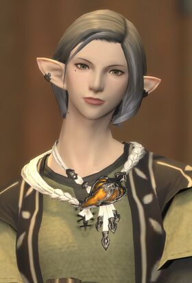 Miounne runs the Carline Canopy in Gridania. From the establishment's open terrace, one can see the mighty waterwheel built by the Wildwood woman's best friend, Figaga Figa, and always smell the comforting scent of tea-Miounne's passion. Indeed, she can prepare a most reinvigorating brew, thanks to her talents as an herbalist and mixer of medicines. At the age of thirty six, Miounne is a well-known figure, having done much to aid the city-state. This is in no small part due to her role in the Adventurers' Guild. As the Gridanian liaison, she has earned the trust of not only adventurers, but also of the townsfolk who can come to her when they require a reliable hand.