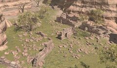 “Abandoned during the imperial occupation, this now-ruined settlement housed the soldiers who manned the Pyre, as well as their immediate families. The handful of scraggly trees in the area once provided the inhabitants with a convenient source of firewood.