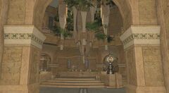 A large atrium in the heart of Ul'dah, the Gold Court's opulence and scale make it a popular meeting place for the city's elite. The plaza was once reserved for the sultan's private balls, but has since been opened to the public due to a lack of funds to maintain the majestic hanging fountain at its center.