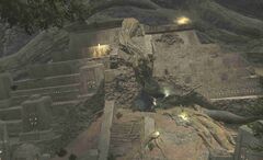 “Though still an impressive structure, the largest of the pyramids has lost some of its majesty to a gigantic tree root crushing it from above. The end of the root has pierced through to a lower level, breaking open a wall and creating an opening into the ruins.