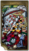 The figures thus recognized by the council become a ubiquitous sight in Eorzean society. They might appear as the subjects of theatrical productions or children’s picture books, but perhaps the most common saintly encounter for adventurers is found in the stained-crystal illustrations of leve plates. As seen below, each leve plate features the depiction of a scene from a chosen saint’s life, titled with a word which encapsulates the personage’s most prominent virtue.