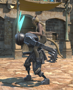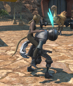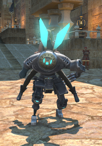 This advanced bipedal machina was found wandering the Carteneau Flats by a quartermaster of the Eorzean Alliance. While it bears a striking resemblance to Allagan clockwork soldiers, it appears to have been enhanced by unknown hands (or paws).— In-game description