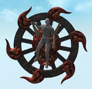 Appearing as an oxcart wheel adorned with a demonic face, this automaton originating from the Far East is created in the likeness of mythical apparitions that steal the souls of any who look upon them. While originally intended to repel intruders, it can also serve as a mode of transport for those with sufficient endurance.